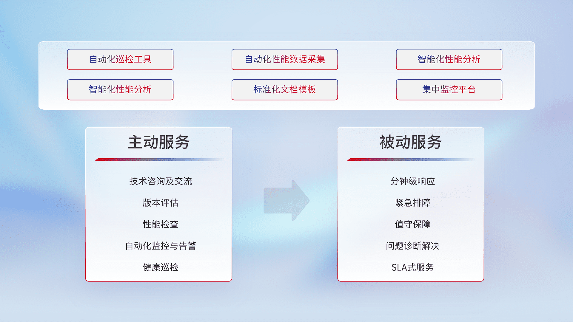 智能化工具和标准化文档,,,保障服务质量,,,提供主动服务(包含技术咨询、、、版本评估、、、性能检查、、自动化监控与告警、、健康巡检)和被动服务包含(分钟级响应、、、紧急排障、、、值守保障、、、问题诊断解决、、、SLA服务)。。。。